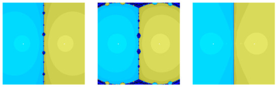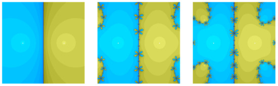 Here, an efficient way to ensure such a global convergence is to employ the theory of attraction basins to check the convergence type. To this aim, a square in the complex plane is considered where . Then, this area is divided by a mesh at which each point of the mesh is colored based on the root it converges. Note that it is colored black in the case of divergence. The stopping criterion for the iterative methods in this subsection is . The results are given in Figure 1, Figure 2 and Figure 3 and are shaded based on the number of iterations. Some competitors from the Padé family are also plotted to show the local convergence in contrast to the global convergence.