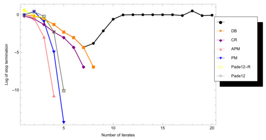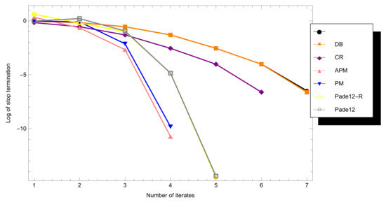 The results in this test are compared to Pade12 and Pade12-R of the same order of convergence, coming from the Padé family of methods. Computational pieces of evidence are brought forward in Figure 4 and Figure 5 for Example 1 with . For the tested examples, the effectiveness of the obtained numerical results compared with some existing methods can be seen, and it was observed that the PM and APM beat all their other competitors by reaching the stopping termination as fast as possible. In fact, the results reveal that PM of the fourth order of convergence was faster than Pade12 and Pade12-R of the same order of convergence, while all had almost the same computational complexity. PM mostly requires one fewer iterate, in contrast to Pade12 and Pade12-R, which state a lower number of matrix matrix products and one less computation of the stopping termination in Equation (33).