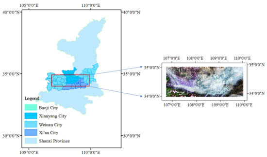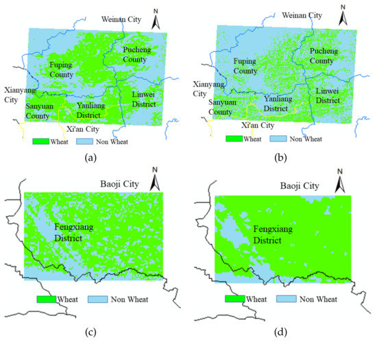 In order to prove the accuracy of the method, the accuracy of the winter wheat obtained on 15 March 2014 was verified from the spatial location using the decoded data of LANDSAT 8 images, which were downloaded from the geospatial data cloud website of the Chinese Academy of Sciences and selected based on the principle of key winter wheat phenological periods and fewer clouds, with the selected times of 17 March 2014, 22 April 2014, and 18 May 2014. The first two times were selected, respectively, as the greening stage and the tasseling stage of winter wheat, when winter wheat was at its peak growth. Finally, some of the main winter wheat production areas in the Guanzhong Plain were used as validation areas, including Fengxiang District, Qishan County, and Meixian County in Baoji City; Fuping County, Linwei District, and Pucheng County in Weinan City; Yanliang District in Xi’an City; and Sanyuan County in Xianyang City, to verify the spatial structure distribution of multiple crops at the county scale. As shown in