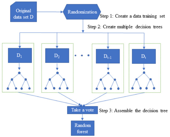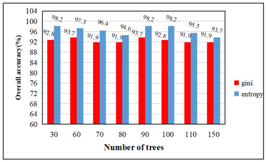 The random forest classifier is a decision tree modeling of resampled multiple samples, which is freely grown into a single decision tree using the CART algorithm, and then the results are predicted by voting. In this paper, the impurity function (impurity) in the decision tree definition node splitting in the random forest algorithm of integrated learning uses the entropy and gini index. In order to facilitate the adjustment of parameters, this paper uses the 3 March 2013 image. The relationship between the number of trees, the overall classification accuracy, and the time taken to create the model is explored on the basis of the entropy and gini index of the random forest classifier selected for integrated learning. The ntree indicates the number of trees, the default number of variables is 3, and the parameters are custom adjusted; ntree = 30, 60, 70, 80, 90, 100, 110, 150 for the test, as shown in the following table, regardless of whether the impurity function is entropy or the gini index. As ntree increases, the time taken to create the model gradually becomes longer. From the image results of 3 March 2013, the overall accuracy of the impurity function using entropy classification is greater, but due to the difference in the impact of each image, after testing the image maps of other time phases, it was found that the overall difference in the accuracy results of the two functions is not very high.