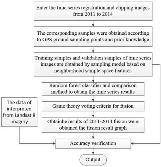 In this paper, we acquire several good quality image maps from the National Satellite Meteorological Center for the time period of 2011–2014. After image preprocessing steps, such as correction and cropping, samples are selected at MERSI based on GPS positioning and a priori knowledge of LANDSAT 8 30 m image interpretation data. This paper solves the drawbacks of traditional sample extraction methods and proposes a method that, when a certain image element of a feature category is randomly selected as a training sample, this sample is used as the origin, and similar samples whose distance to it is within a customized threshold are judged. This method avoids the possibility of duplicating training and validation samples in the traditional method. Different classification methods are used to extract feature distribution maps of the Guanzhong Plain and fuse them into one distribution map. Finally, the accuracy of the extraction results is verified with data from field surveys and LANDSAT 8 image interpretation data. The results show that the random forest classifier has the highest overall accuracy and consumes time within an acceptable range, and the overall accuracy is higher than the accuracy of the other four types of machine learning and the current emerging deep learning classification methods in the paper. Deep learning consumes a long time and is not suitable for the small sample classification in this paper. The extraction accuracy after fusion is relatively higher and more accurate than that of most images before fusion, with the highest accuracy of 98.63% for winter wheat in 2014. Thus, the random forest classifier based on neighborhood samples in this paper not only effectively improves the classification accuracy of remote sensing images, but also avoids the problem of false high classification accuracy, which is of practical significance for crop yield estimation and government food regulation, and provides a new technical reference for future remote sensing research.