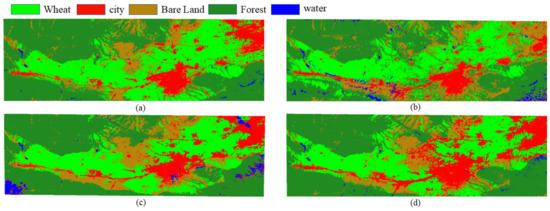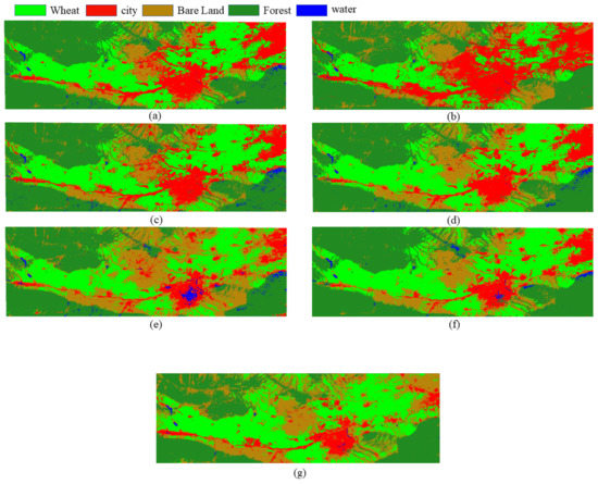 Section 4.2, and the accuracy of the classified winter wheat can reach 100% for most of them because of the more obvious characteristics of winter wheat and the rapid extraction of winter wheat in the selection of samples. For the bare land and open urban areas in the medium resolution satellite, the difference between the two features is not obvious. In addition, some of the bare land will grow other vegetation in April and May and may be misclassified as winter wheat or forest land, so the overall classification accuracy of the seven methods will be reduced compared with the winter wheat accuracy.