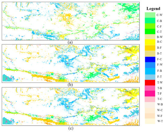 In this paper, we analyze the land use changes in the study area from 2011 to 2014, i.e., the changes of feature types in the same image element in different years, using the image map after fusing the random forest classification of integrated learning from 2011 to 2014. The fused classified images are shown in