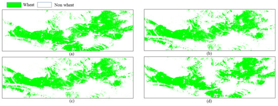 Table 4, the methods selected in this paper have high accuracy for extracting the most obvious features of winter wheat, but because the distinction between bare land and some urban features with few buildings is not obvious, such supervised classification like traditional MMD and MD is based on the selected sample features, so it is easy to confuse features with similar characteristics. RF also has this disadvantage, but because it is the result of 100 decision trees voting, the accuracy is better. However, the selection of samples requires much effort to ensure that the selected sample categories are correct in order to make the accuracy higher. Because winter wheat is a major food crop, remote sensing images that accurately extract the winter wheat planting area are very important. The accuracy is not yet high enough and needs to be further improved.