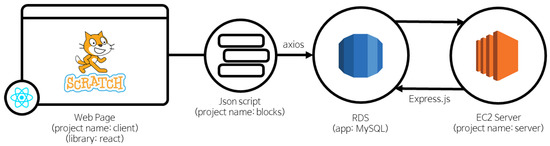 This study examines the relationship between the learner’s programming process and the learner’s proficiency. For research, we need data quantifying the learner’s programming process and a learning model to analyze these data. A separate log collection tool is required for data collection. The tool used for log collection is a programming log crawler developed for this work. The programming log crawler processes data in two servers, as shown in Figure 1. The result of programming in the Scratch editor is transmitted as a JSON-type script, and the JSON file is transmitted and saved from the client to the database server. If a learner inputs an index before programming, the learner and the project are stored separately in the database.