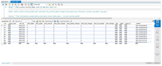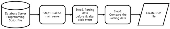 The learner’s programming log stored in the database server is in the form of a JSON script. These data need to be called to the main server, but because a comparison target is needed, all data before and after the click are loaded. In the loaded JSON script, only the necessary data are parsed and then the data are compared. This compared result value is created and saved in CSV format. The CSV file consists of the same seven columns as in Figure 5, but it is composed of different rows because the number of clicks used for the task is different for each student.