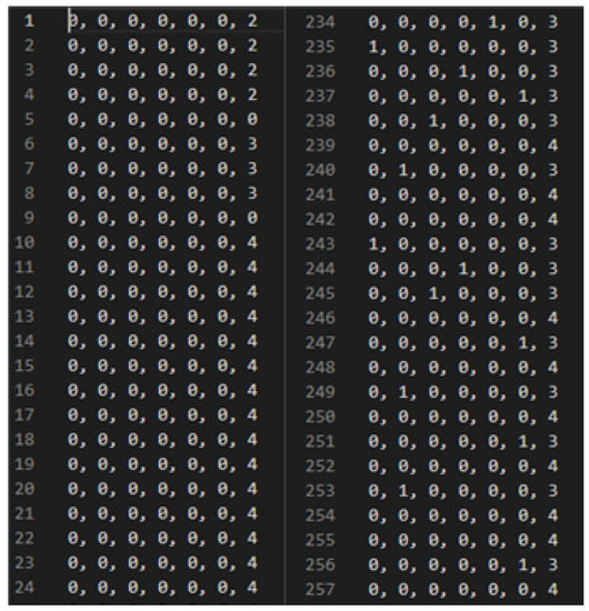 In the data above, the log the learner programmed is in “{“meta”:.... By parsing the programming log in this area and comparing the necessary data, the behavior type can be extracted. The extracted behavior types were classified into eight types of blocks including the first seven types: ’add code’, ’delete code’, ’code copy’, ’code order change’, ’code position change’, ’code internal value change’, and ’no change’ and by adding an eighth type ’detection of other changes’ as an extra. The data to be actually generated are composed of seven columns using seven types, excluding ‘detection of extraneous changes’. The configured database is displayed as in Figure 3.