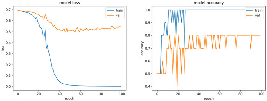 The result of measuring the accuracy for each epoch through the generated model is as shown in the graph on the right of Figure 6. In the case of the training model in which the loss was converging to 0, the accuracy was 100% from 11 epochs. In the case of the validation model, after measuring 70% accuracy for the first 10 epochs, unstable results showed 40% accuracy at 20 epochs. After 50 epochs, the accuracy was 70–80%.