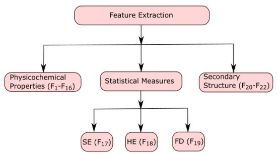 Every ALDH2 sequence was represented using 22 features. These features were denoted by to . The features from to were computed using physicochemical properties of all fourteen sequences, and these properties were computed using the online web server ProtParam [15]. The features , , and were calculated by using Shannon entropy, Hurst exponent, and fractal dimension, respectively. The features to were computed by the secondary structure of protein sequences by using the online web server CFSSP [29]. The characterization of feature extraction is shown in Figure 1.