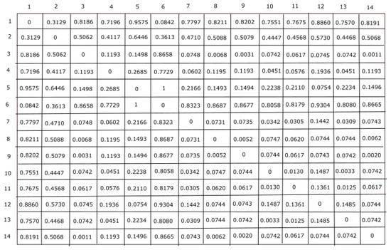 Here, and represent the jth feature for the species and , respectively. The distance matrix for all fourteen species is given in Figure 2.