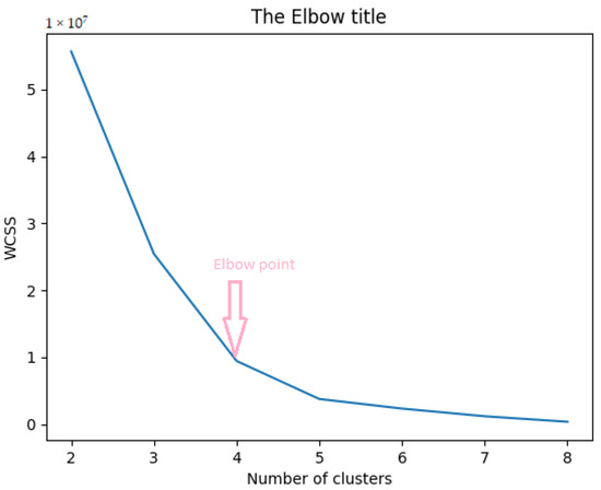 After finding the distance matrix, we applied K-means clustering. The first step is to find the value of K. We used the elbow method to find the optimal value of K (numbers of clusters) [31]. For every value of K starting from 2, we computed WCSS (Within-Clusters Sum of Squares), i.e., the sum of squared distance among every sample and its nearest centroid of a cluster. As the value of K increases, the sum of squared distance decreases. To find the optimal value of K, we chose the value of K at the elbow point where WCSS starts decreasing linearly. Thus from Figure 3, we selected the value of K as 4. The following equation calculates :