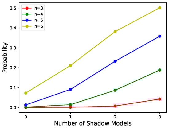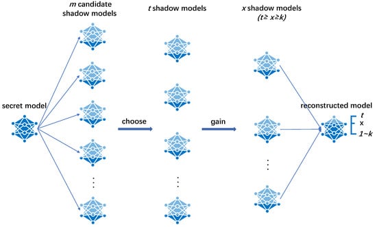 - Calculate . m is the number of candidate shadow models. m is calculated based on the following. When obtaining t shadow models, the secret parameters can be recovered by t shadow parameters at any position of the model. In other words, even if t shadow parameters contain all invalid parameters, there are at least k valid parameters, i.e., .Next, m candidate shadow models are generated, from which t models are selected and assigned to t participants. Each participant has exactly one shadow model.