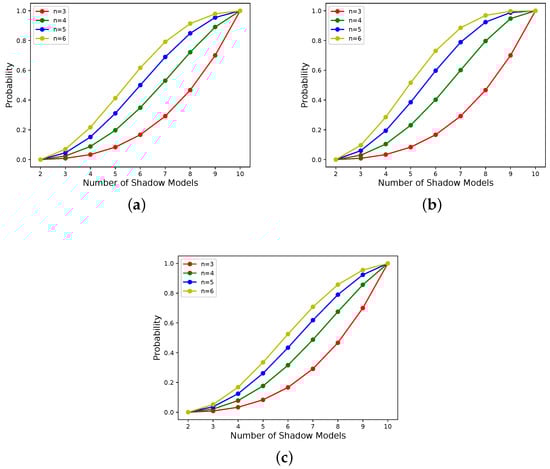 When n is constant, the relationship between x and for different determined sharing states. (a) All candidate shadow models’ weights and shadow models’ weights are 1. (b) 3 of candidate shadow models’ weights are 10, and the rest are 1. 3 of shadow models’ weights are 10, and the rest are 1. (c) 3 of candidate shadow models’ weights are 1, and the rest are 10. 3 of shadow models’ weights are 1, and the rest are 10.