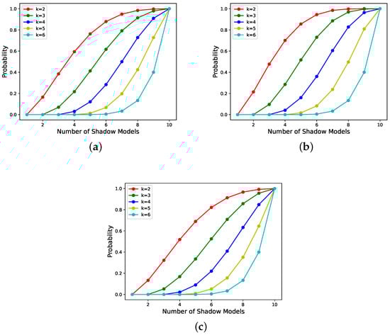 We consider that if a reconstructed model has more of the same number of parameters as the secret model at the corresponding position, its performance is closer to the secret model. For any location where the secret parameter is hidden, the parameter of the secret model can definitely be obtained in the recovery phase when the number of valid integers extracted, j, is more than k. Thus, the probability of (i.e., ) in a sharing state which is determined by the weights of the m candidate shadow models, and the weights of the t selected shadow models, can reflect the performance of the reconstructed model.