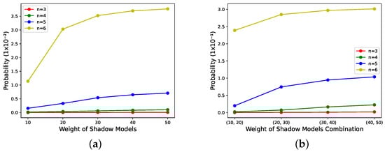 The above results show that the scheme proposed in this paper is feasible in weight validity. Its weight validity is inferred as follows. The larger the sum of weights of , the higher the performance of the reconstructed model for a determined sharing state. However, either figure’s weight validity is not obvious or almost non-existent when . As the probability of obtaining a valid integer for the secret models with weights of 1 at is minuscule, when the number of shadow models with weights other than 1 in is less than 3, is limited by the probability of obtaining valid integers for shadow models with weights of 1. As n increases, the proportion of candidate shadow models with weights of 1 increases, and its limitation on becomes smaller and smaller. The weight validity is reflected.