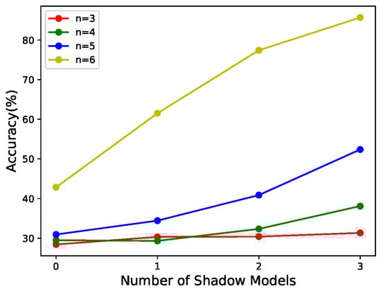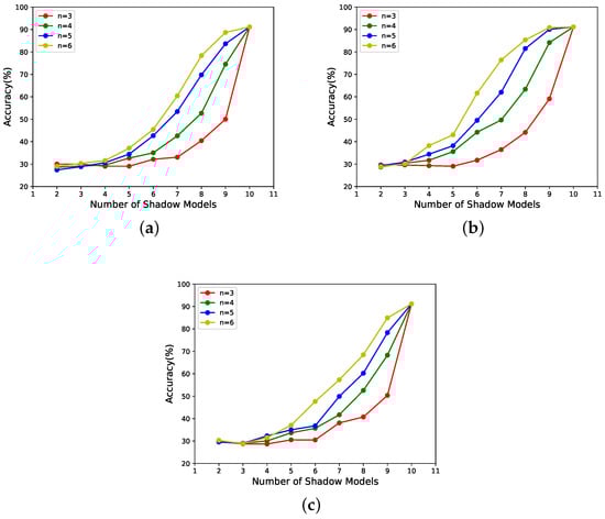 - According to Figure 8 and Figure 9b,c, it can be seen that this scheme has weight validity when the number of shadow models with large weights is involved in the recovery, and the values of n are large. The larger their values are, the stronger the correlation between the performance of the reconstructed model and the weights of the shadow models in the recovery phase.