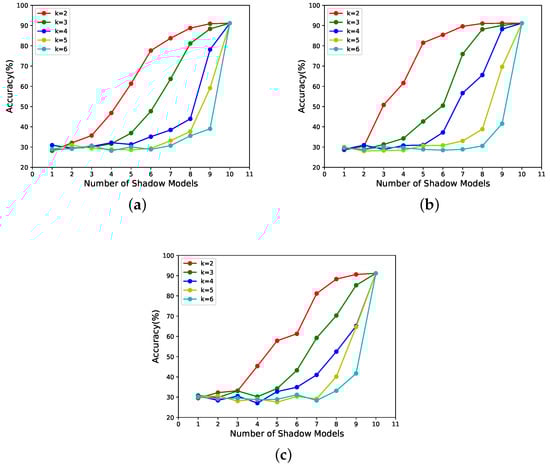 For -threshold NNSS with the weights of as {10,10,10,1,1,1,1,1,1,1}, the performance of the reconstructed model is related to the number of shadow models with a weight of 10 in , as shown in Figure 8 when . For -threshold NNSS with the weights of as {10,20,30,40,50,1,1,1,1,1}, the performance of the reconstructed model is related to the shadow models with weights other than 1 in when , as shown in Figure 9.