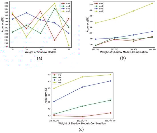 When n is constant, the relationship between x and the performance of reconstructed model for different determined sharing states. (a) All candidate shadow models’ weights and shadow models’ weights are 1. (b) 3 of candidate shadow models’ weights are 10, and the rest are 1. 3 of shadow models’ weights are 10, and the rest are 1. (c) 3 of candidate shadow models’ weights are 1, and the rest are 10. 3 of shadow models’ weights are 1, and the rest are 10.