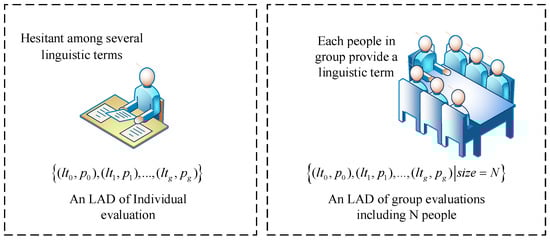 LDAs are very common, and they can depict fuzzy information. As we know, there are two types of LDAs: “individual evaluations” and “group evaluations” (see Figure 1). In general, LDAs depend on a linguistic term set which is pre-given. Individual evaluation refers to a decision-maker who is irresolute about several linguistic terms, then he/she can use LDA to express his/her opinion. Group evaluation mean that there are members in a group. Each member in the group provides only one linguistic term for the evaluation event. Then the evaluations given by members make up an LDA of group evaluation. Most LDAs are group evaluations, e.g., online reviews movie ratings, hotel rankings, etc. Thus, we concentrate on group evaluations of LDAs. Wu et al. [] defined the concept of LDAs with sample capacity.