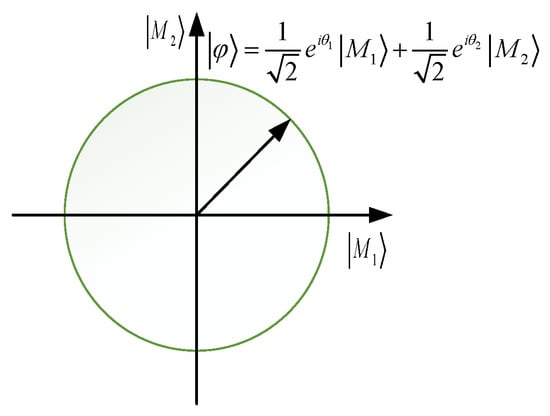 In the framework of CPT, the events are subspaces of sample space , while in QPT, the events are regarded as subspaces of the Hilbert space, which are mutually exclusive or related []. Take an event with two basic states as an example: the Hilbert space consists of a set of orthonormal basis vectors, which can be written by: , where = (1,0), = (0,1).