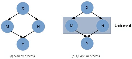 Quantum probability theory holds that the target state can be realized by the superposition of path trajectories when several paths are not observed. The transition from initial state to final state has multiple unobserved paths (Figure 3b). So, the final probability of is equal to the square of amplitude. It can be written as: