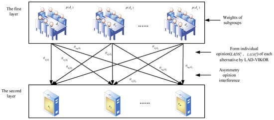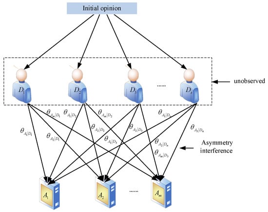 From the analysis of Equations (8) and (9), one can easily find that asymmetric interference exists in a MAGDM problem. The interference effects of two decision-makers on different alternatives may be a little more or a little less than the other, which is more in line with a realistic decision-making situation. Therefore, our paper mainly discusses the decision-makers’ asymmetric interference effects in MAGDM. Although the interference effects may exist among more than two decision-makers, we can transform such interference effects into a set of interference effects among two decision-makers. Now we can generalize it to the case of decision-makers evaluating alternatives, as shown in Figure 5.
