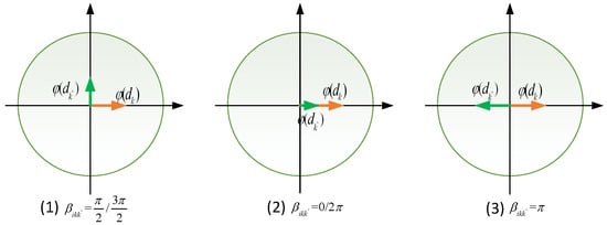 Moreira et al. [] only considered the case of one alternative. They assigned and to , and did not take into account. He et al. [] generalized the group decision problem to MAGDM on the basis of []. They concluded that is equal to , and is equal to . Therefore, the value of phase difference is equal to the phase of minus the phase of , i.e., . However, compared Equation (8) with Equation (9), the interference terms of and , i.e., and , are different. For and , the interference terms of them will varies with the value of and . It is obvious that these phase difference should not be ignoring, and interference terms are not always equal. In other words, the values are distinct when .