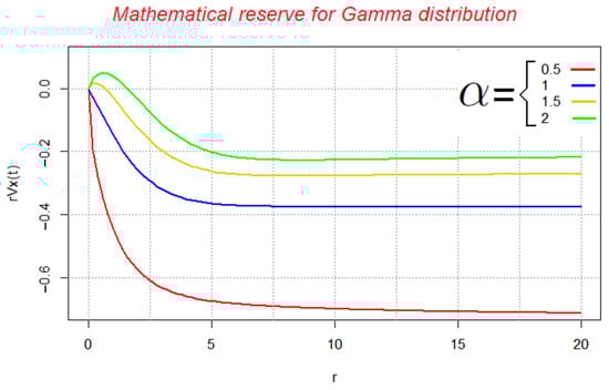 Mathematical reserve , for Gamma distribution with parameters , and .