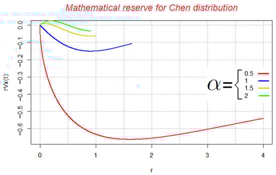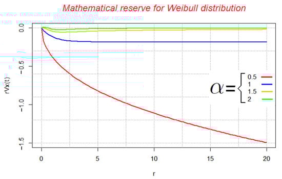 Section 7.3 in [] mentions that, in most applications, mathematical reserves are positive. However, there is no theoretical support that guarantees it. In fact, Figure 2, Figure 3 and Figure 4 would represent a reliable counterexample to any result that affirms that the reserves must be positive. It is also important to note that the values that we assign to the shape parameter α in each of the studied cases correspond to different periods of operation of the extraction tool (see [], Chapter 1): from the period in which the machinery is new (), passing through the period of normal operation (), and until reaching the decay period (). Two things are noteworthy.