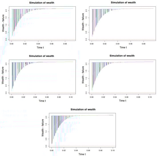 where . To apply the inverse transformation method, we take a (pseudo) random sample of size n from the Uniform distribution on : . For each , , we apply the inverse transformation method using the expression (24). With this, we obtain different, and each one represents the time in which the failure of one of the agents occurs. For each , we build a trajectory for the wealth. It is important to mention that the difference between the various trajectories that we simulate is the moment of failure. The other elements remain identical in each one because both, the payment of the premium and that of the dividends, remain invariant over time.