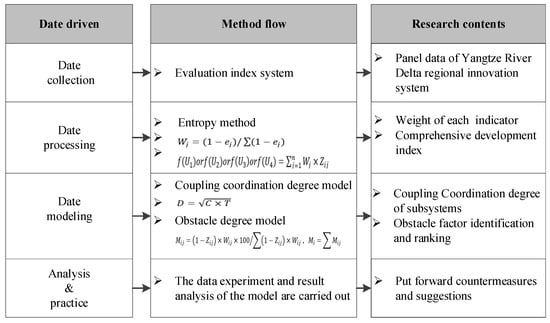 To meet these challenges and improve the development level of RIS, this study constructed a measurement, evaluation, identification, and optimization method of coupled and coordinated development of a regional innovation EROB composite system based on data. Data collection was mainly performed to gather relevant data on aspects such as the regional innovation environment, resources, output, and benefits. Data processing was used to calculate the index weight and comprehensive development coefficient using the entropy method. Data modeling was performed to build a CCDM to measure the coupling and coupling coordination degrees and use the obstacle degree model to identify the key obstacles affecting development. Innovation practice was employed to apply the constructed method to the Yangtze River Delta (YRD) region (three provinces and one city), verify the model, obtain evaluation results, and put forward policy suggestions to promote the development of a regional innovation EROP composite system. A flowchart of the study’s method is shown in Figure 1.