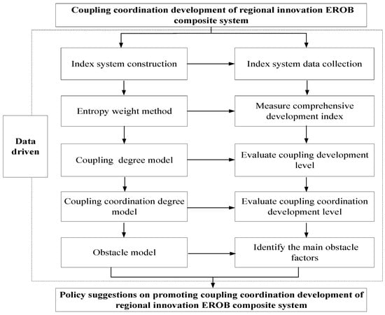 The first step was to construct the evaluation index system of coupled and coordinated development of a regional innovation EROB composite system from the four dimensions of innovation environment, resources, output, and efficiency. The entropy method was used to calculate the comprehensive development coefficient of the regional innovation EROB composite system. The second step was to build the coupling degree model, CCDM, and obstacle degree model to measure, evaluate, and identify the coupling and coordination degree of the regional innovation EROB composite system. The third step was to analyze the comprehensive development level of the regional innovation EROB composite system, according to the measurement results of the comprehensive development coefficient. Based on the evaluation results of the coupling and coordination degree of the regional innovation EROB composite system, the coupling and coordination development levels among the subsystems in the composite system were analyzed. Based on the main obstacle factors that restrict the coupling coordination development of the regional innovation EROB composite system, the shortcomings of regional innovation development were supplemented, and policy suggestions were put forward.