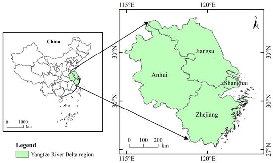 The YRD region is among the regions with the most active economic development, the highest degree of openness, and the strongest innovation ability worldwide [89]. Today, the YRD region (Figure 3) includes three provinces (Jiangsu, Zhejiang, and Anhui) and one city (Shanghai). The regional area is 358,000 km2, with a permanent resident population of more than 200 million. The regional GDP accounts for about one-quarter of the national total. The coordinated economic, ecological, energy, urban, and industrial development in the YRD region has been widely studied [90,91,92]; however, less research has been conducted on the area’s coordinated RIS development. Under the national innovation-driven development and regional coordinated development strategies, this area may show significant regional differences and city differences in the coupling coordination development of RIS, which may affect its high-quality development. Therefore, this study constructed a regional innovation EROB composite system, and evaluated, measured, identified, and optimized the coupling coordination development of this composite system, to promote high-quality RIS development in the YRD region.