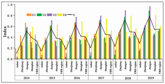 According to the above evaluation index system, the development and comprehensive development indices of each subsystem in the YRD region between 2014–2019 were calculated using Equations (1)–(6) of the entropy method, as shown in Table 4 and Figure 4.