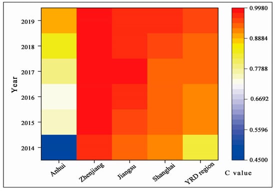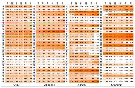 To illustrate the effectiveness and feasibility of the method described in Section 2, we used the YRD region as the research object to verify the method. To ensure the authority and reliability of basic index data collection, relevant data on RIS development between 2014–2019 were selected, including the statistical years from provinces and cities, from the China Statistical Yearbook, China Science and Technology Statistical Yearbook, and China Environmental Statistical Yearbook. The type of data used was panel data.