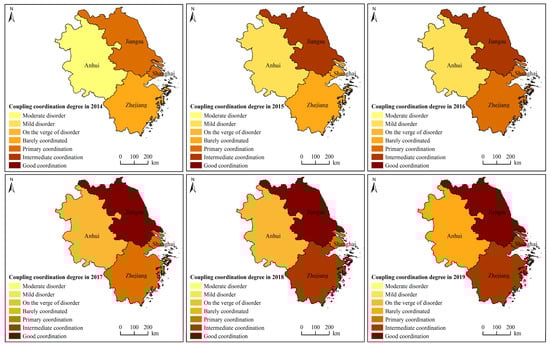 Based on the results from calculating the coupling degree, the coupling coordination development degree between subsystems of the regional innovation EROB composite system was further calculated. The equation is as follows: