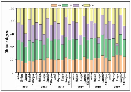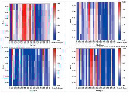 The purpose of an obstacle degree model is to diagnose the obstacle factors affecting the coupling coordination development of a regional innovation EROB composite system [88]. Based on the analysis of obstacle factors, it is conducive for the government to formulate and adjust coordinated development policies and measures of the regional innovation EROB composite system. The equation is as follows:
