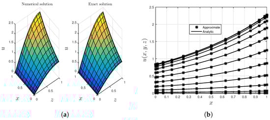 Numerical matched with exact solutions for Example 1 when . (a) Solutions in 3D form when . (b) Solutions in 2D form for various y when .