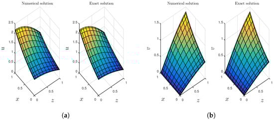 Numerical matched with exact solutions in 3D form for Example 3 when . (a) Surface solutions of u when . (b) Surface solutions of v when .