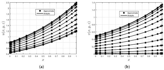 Numerical matched with exact solutions in 2D form for Example 3 when . (a) Solutions of u for various y when . (b) Solutions of v for various y when .