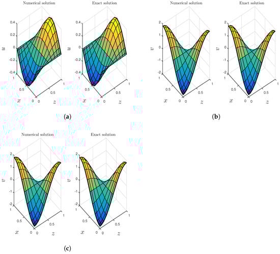 Numerical matched with exact solutions in 3D form for Example 4 when . (a) Surface solutions of u when and . (b) Surface solutions of v when and . (c) Surface solutions of w when and .