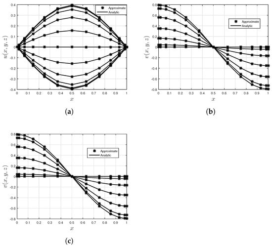 Numerical matched with exact solutions in 2D form for Example 4 when . (a) Solutions of u for various y when and . (b) Solutions of v for various y when and . (c) Solutions of w for various y when and .