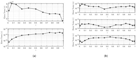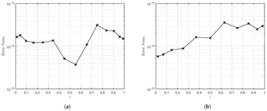 error norms for (a) Example 3 (The error graphs when ) and (b) Example 4 (The error graphs when ) at different values of z.