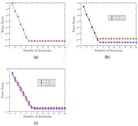 Error norm against the number of iterations when . (a) Convergence graph for Example 2. (b) Convergence graphs for Example 3 when . (c) Convergence graphs for Example 4 when .