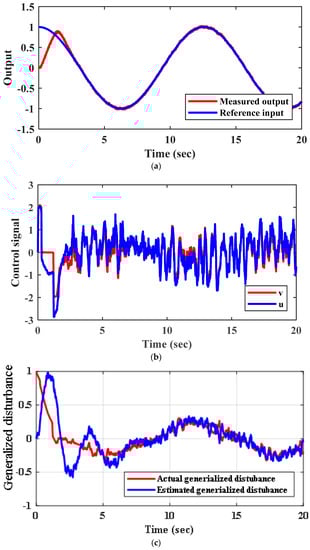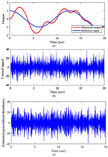 Results of the numerical simulation for Scenario 1: (a) tracking response of the reference input ; (b) control action ; (c) estimation of the generalized disturbance .