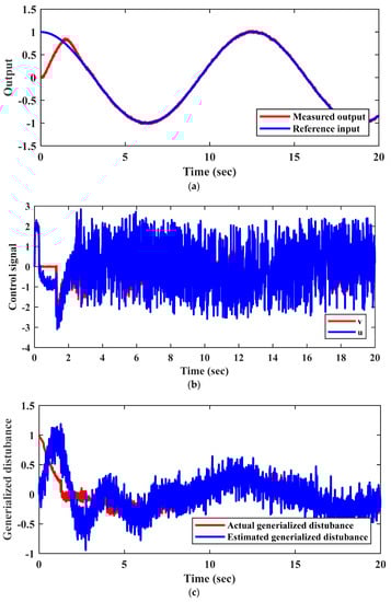 Both the LESO given in Equation (2) and the NHOESO of Equation (5) are used in these simulations to find the estimated states and the estimated generalized disturbance . The response curves of these scenarios are shown in Figure 3, Figure 4 and Figure 5, respectively.
