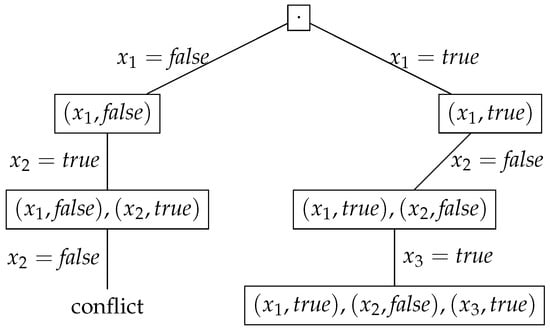 The search space of the DPLL algorithm on the formula in Example 1. Each node contains the current truth assignment and the edges represent assignments made by the algorithm. Vertical edges represent unit propagations, whereas the oblique edges represent decisions.
