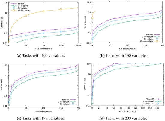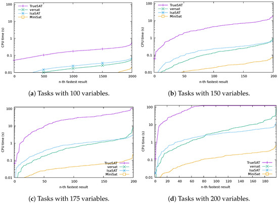 To place the performance of our verified Dafny solver into context, we have also benchmarked against three CDCL solvers: the unverified solver MiniSAT (http://minisat.se/, accessed on 1 June 2022) (with the default settings), the partially verified solver versat, and the verified solver IsaSAT. As these solvers implement the full CDCL algorithm, which can be exponentially faster than DPLL, they are expected to outperform our solver. Figure 9 summarizes the performance of these four solvers.