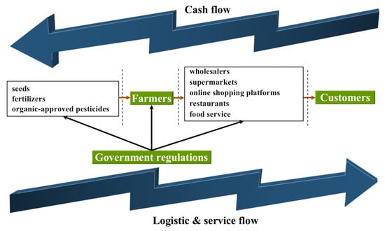 The interaction of stakeholders in an organic supply chain is vital for the future development of organic farming [52]. Since a supply chain is susceptible to factors such as farmer benefits, government regulation, technology evolution and customer preference, it is essential to analyze the importance of these factors before constructing an evolutionary game model [24]. By considering the interaction of stakeholders and then analyzing the formation and evolution of an organic supply chain, we would be closer to a clear and comprehensive understanding of the sustainable development of organic farming.