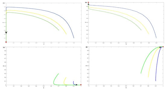Phase diagrams of Cases I–IV (a–d). Here, the initial points are (blue curve), (yellow curve) and (green curve). A red point represents an ESS state and the arrow indicates the direction of evolution.